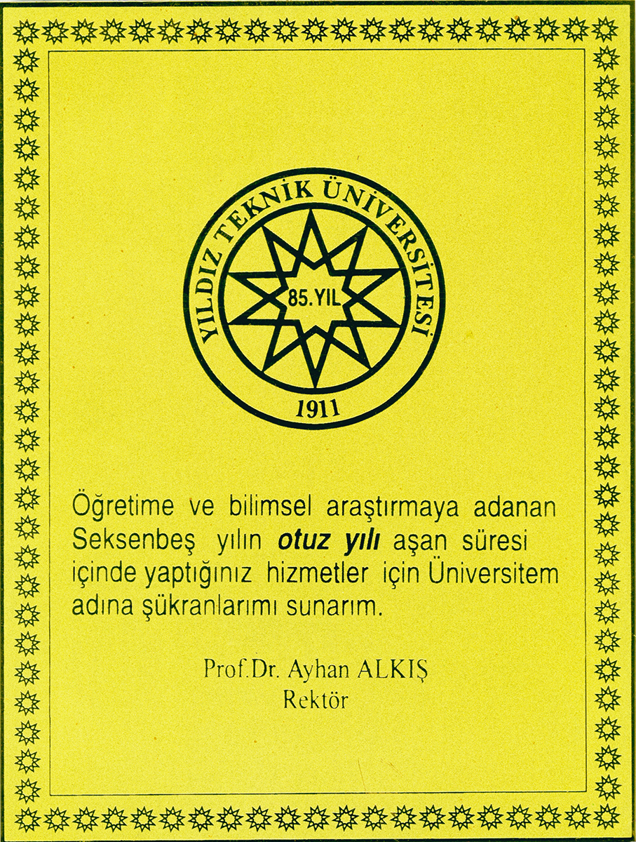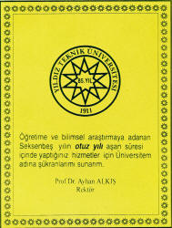 Y:T:Ü: Rektörlüğü teşekkür plaketi |