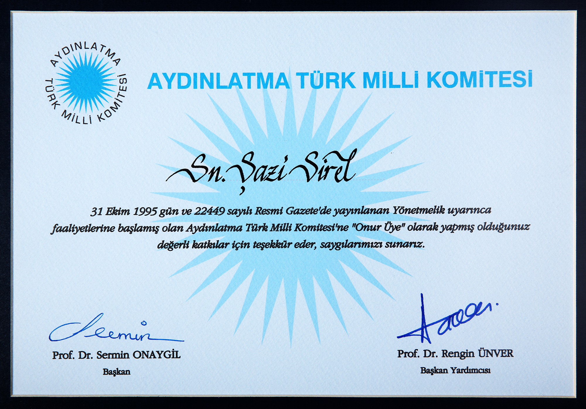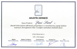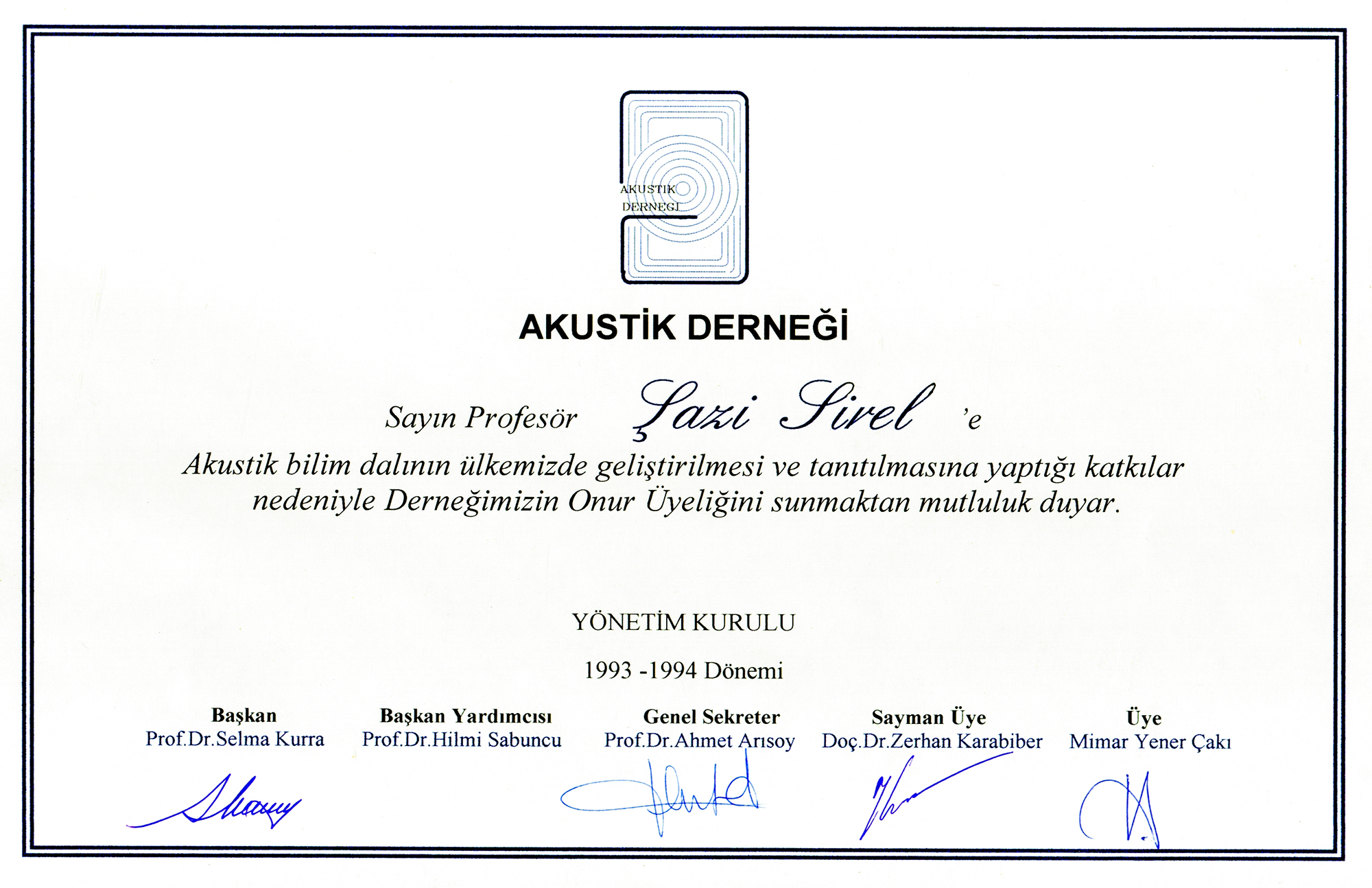 Türk Akustik Derneği Onur Üyeliği Belgesi |